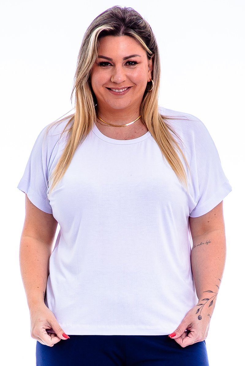 Blusa com manga japonesa, decote redondo e modelagem soltinha.