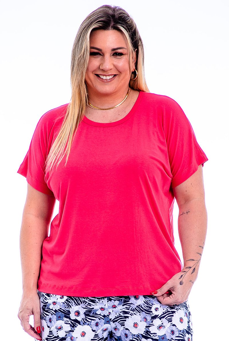 Blusa com manga japonesa, decote redondo e modelagem soltinha.