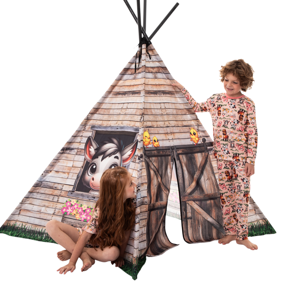 As barracas deixam a festa muito mais divertida e aconchegante! Com uma estampa encantadora, ela cria um cantinho especial para cada criança dormir, brincar e entrar no clima da fazendinha. Além de ser super fotogênica, garante um toque lúdico e confortável para a noite.
