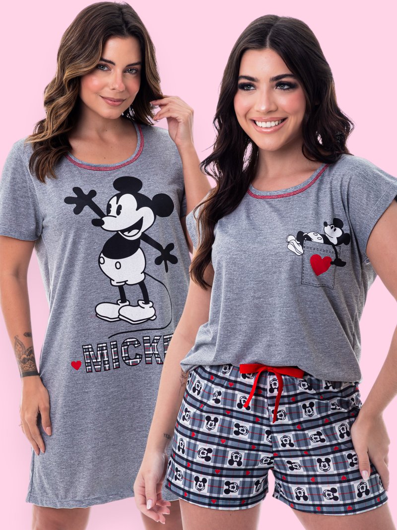Conjunto de pijama curto e camisola feminina em tom mescla de cinza, com estampa clássica do Mickey, ideal para quem busca unir conforto, estilo e praticidade.