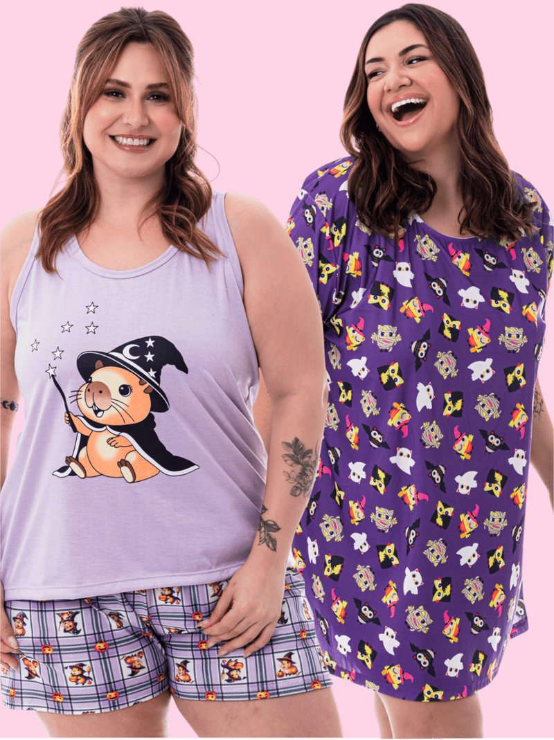 Camisola: modelo soltinho em tom roxo vibrante, com estampa divertida de personagens de Halloween (bruxinhas, fantasminhas e gatinhos), ideal para quem prefere uma peça única mais leve.