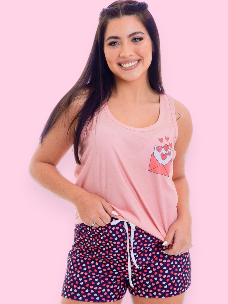 Short confeccionado em meia malha Comfort estampada com os mesmos corações da estampa da blusa.