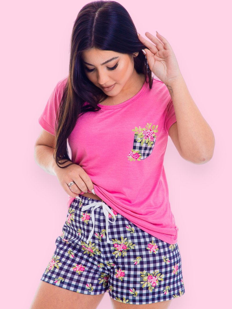 Blusa de manga curta, confeccionada em meia malha com viscose, um tecido mais soltinho ao corpo, macio ao toque, leve e super confortável.Estampa lateral de um bolso xadrez cheinho de flores!Uma blusa muito fofa e confortáveShort confeccionado em meia malha comfort combinando com a blusa.. uma combinação linda e perfeita!Para você que é uma especial é sempre bom dormir com um pijama gostoso e com estilo!!