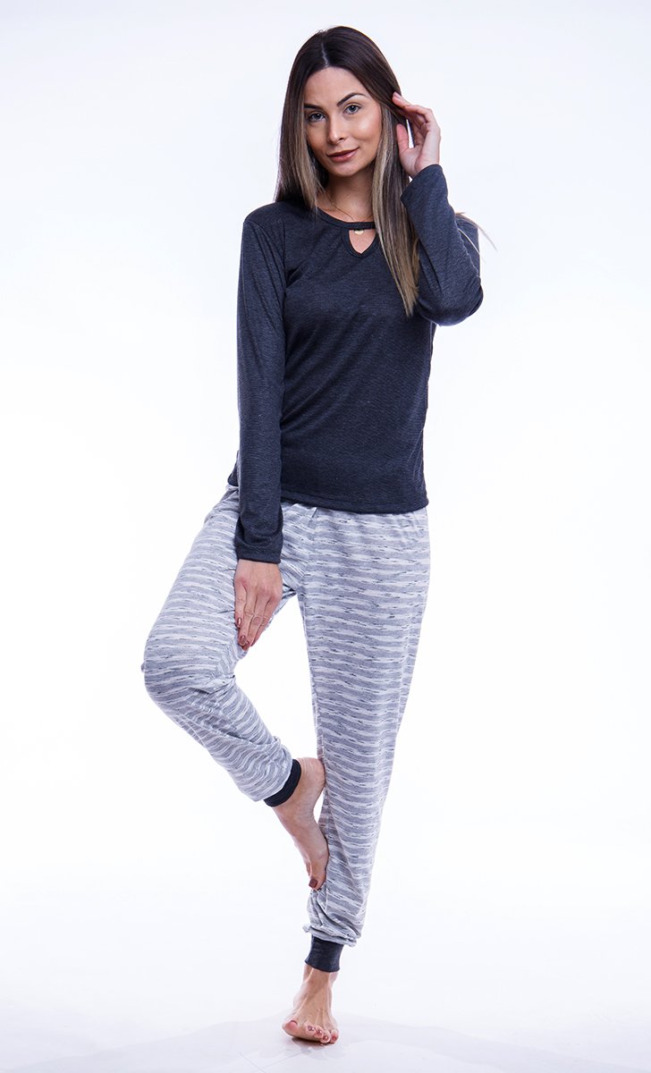 Calça com punho confeccionada em meia malha listrada com cadarço decorativo no cós.