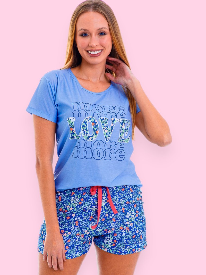 Short confeccionado em meia malha estampada com as flores da estampa da blusa com cadarço decorativo coral aplicado no cós.