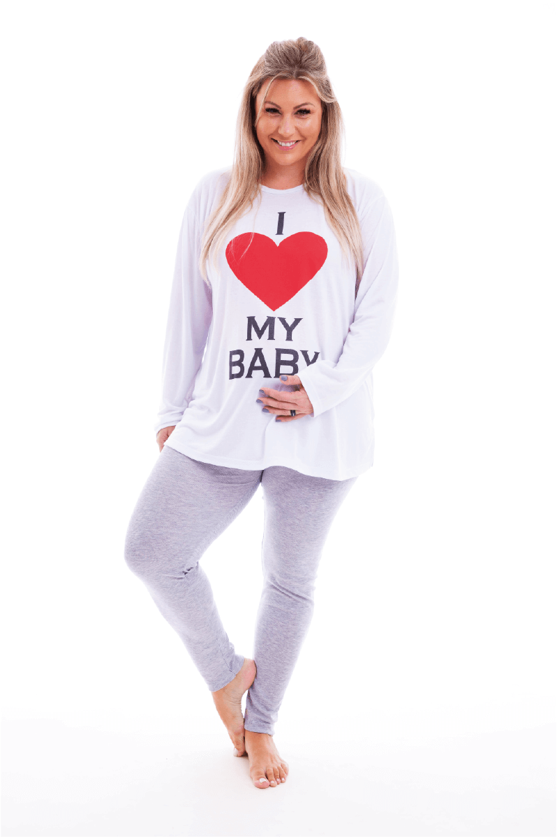 O pijama feminino plus size gestante “I Love My Baby” da Lua Chic combina uma blusa em meia malha branca, leve e soltinha, com uma charmosa aberturinha lateral que facilita o vestir. A estampa “Eu amo meu bebê” com detalhes em brilho confere delicadeza e reforça o vínculo maternal, valorizando a categoria de pijama feminino para gestantes.