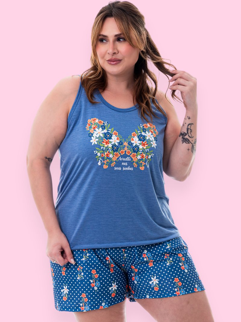Short confeccionado em meia malha Comfort estampada com as mesmas flores da borboleta da blusa e poás.
