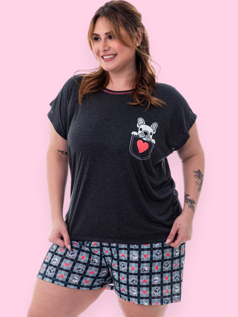 Short confeccionado em meia malha estampada com carinhas do mesmo doguinho da blusa.