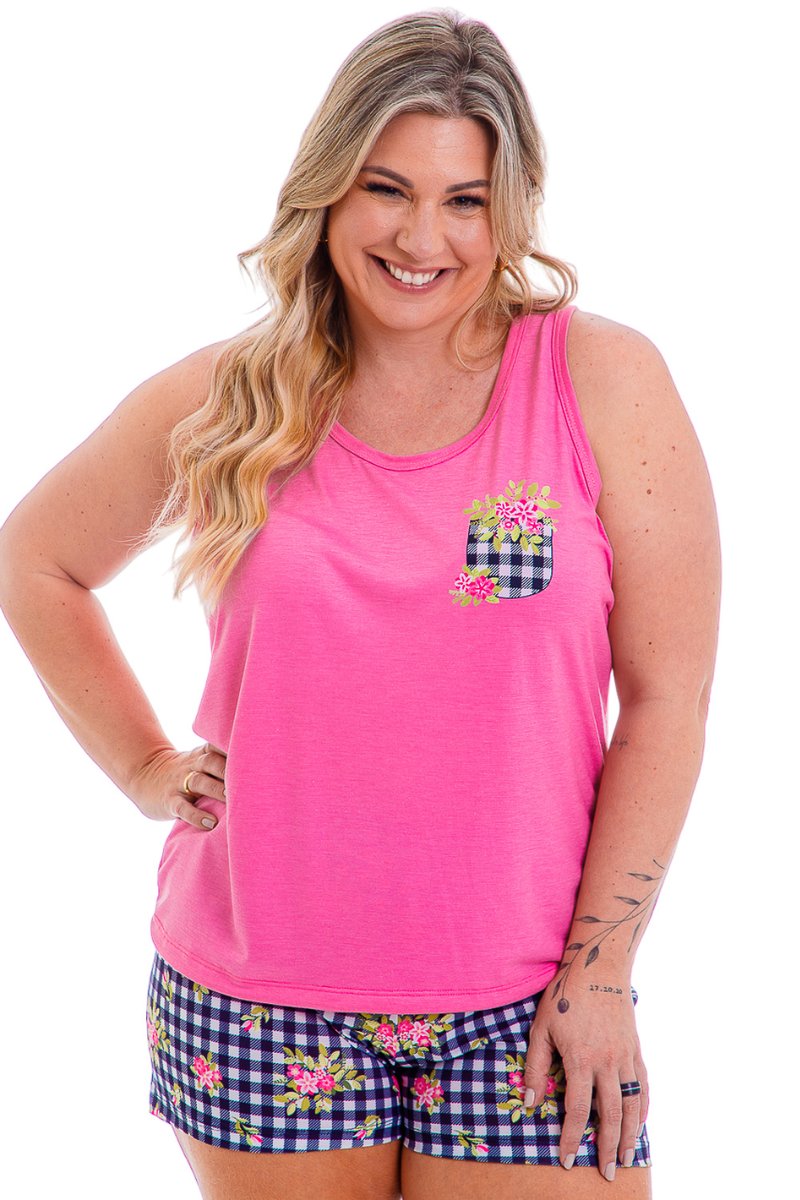 Short confeccionado em meia malha Comfort xadrez e com as mesmas flores da estampa da blusa.