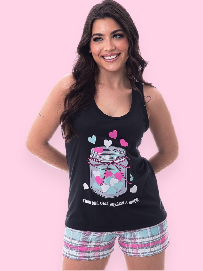 Regata preta com estampa divertida e romântica de pote de corações coloridos e a frase “Tudo que você precisa é amor”.
