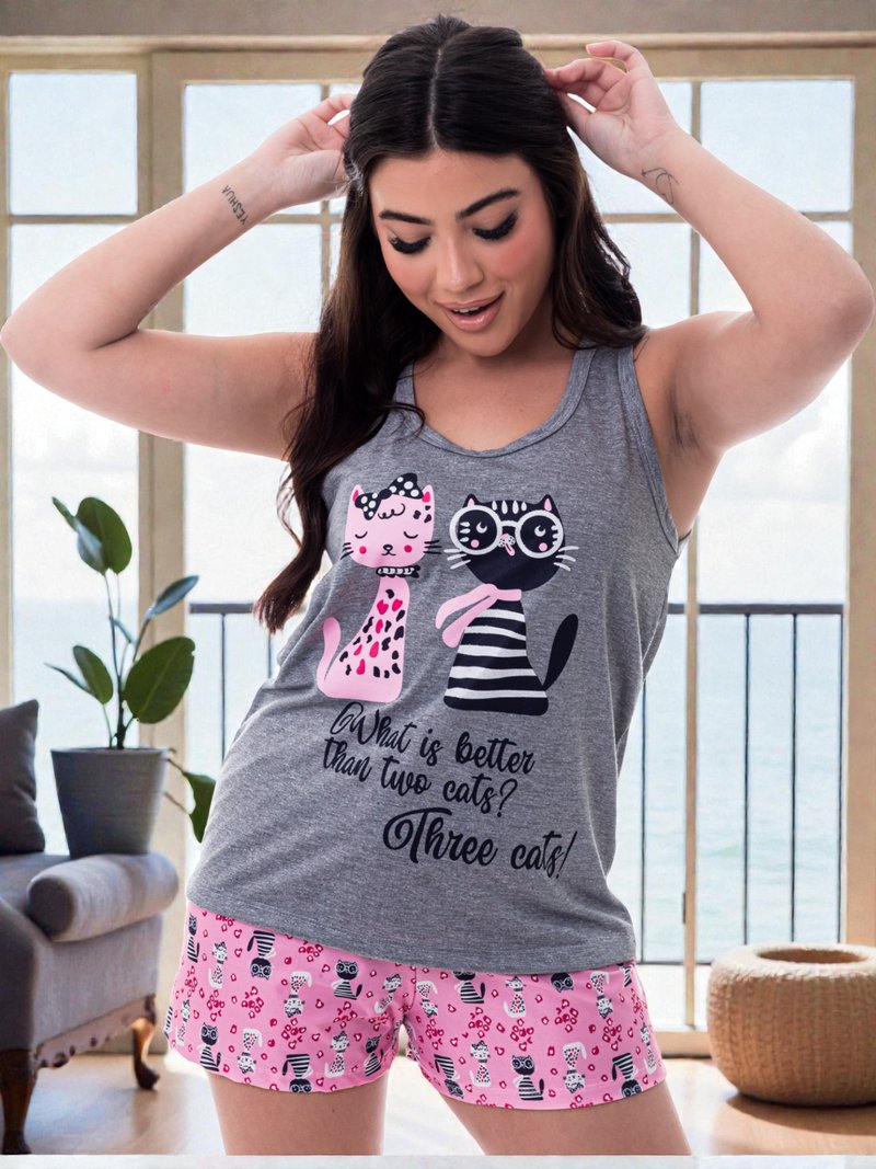 O conjunto é composto por blusa regata cinza com estampa frontal de gatinhos fofos e frase divertida em inglês: “What is better than two cats? Three cats!”.