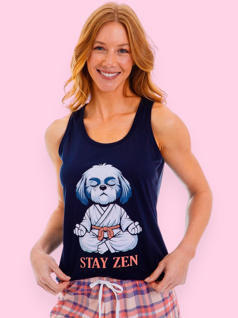 Estampa muito fofa de um cachorrinho meditando e a escrita STAY ZEN !