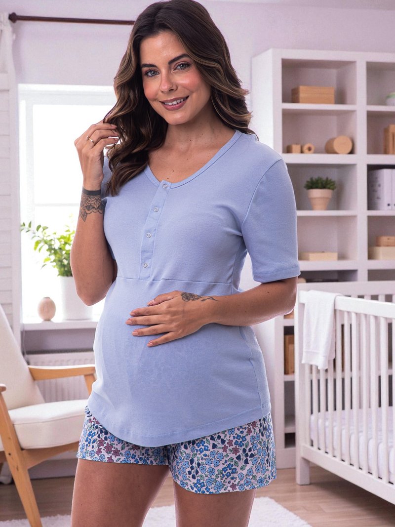 A blusa azul-clara com mangas curtas e abertura frontal por botões permite amamentar com facilidade, oferecendo praticidade e conforto no dia a dia.