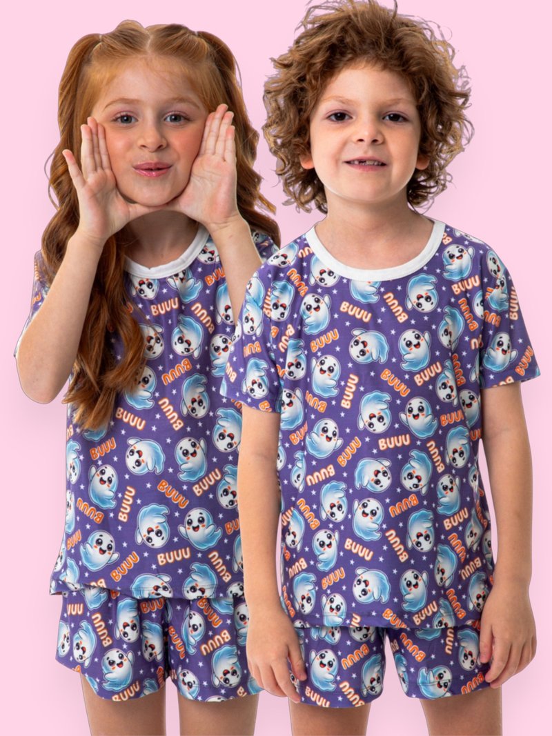 Deixe a diversão e o conforto tomarem conta da hora de dormir com este lindo pijama todo estampado com fantasminhas menina!!