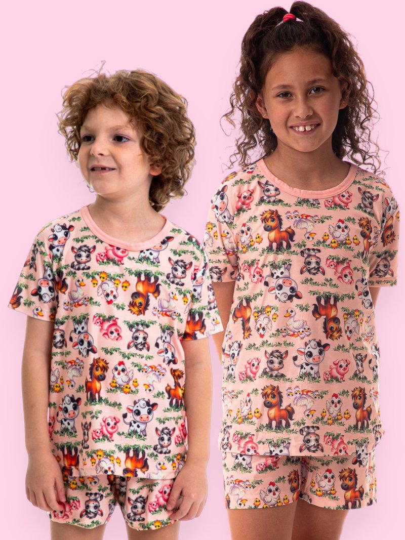 O conjunto é composto por uma blusa de manga curta e um short, ambos estampados com lindos animais da fazenda!