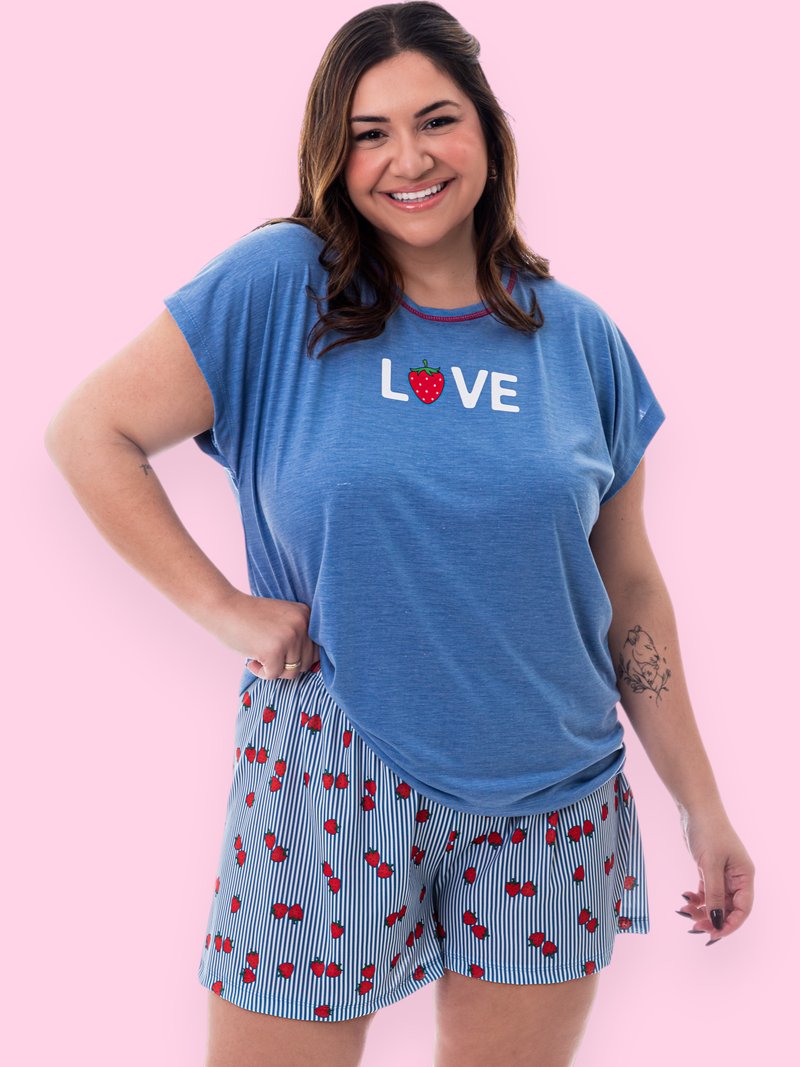 A blusa em tom azul possui modelagem soltinha, mangas curtas e decote redondo com acabamento contrastante em costura vermelha, garantindo conforto e liberdade de movimentos. O destaque fica por conta da estampa frontal com a palavra "LOVE", onde o "O" é substituído por um morango fofo e colorido, trazendo um ar descontraído e criativo ao look.