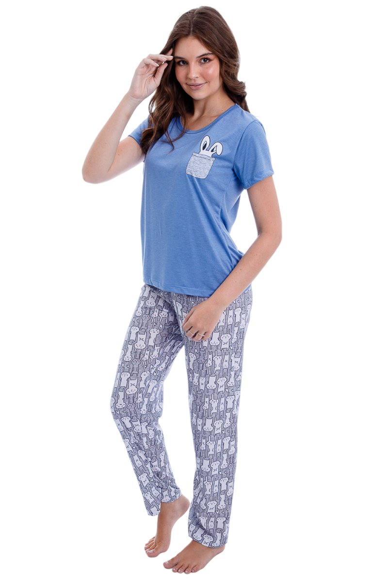 Pijama de inverno, com manga curta confeccionado em meia malha azul.