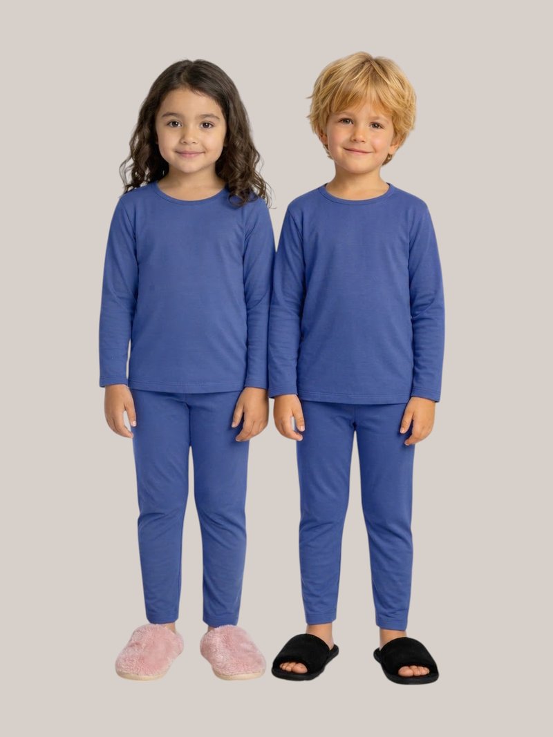 O conjunto é composto por blusa de manga longa e calça comprida, com modelagem confortável que se ajusta suavemente ao corpo, garantindo liberdade de movimento para as crianças.
