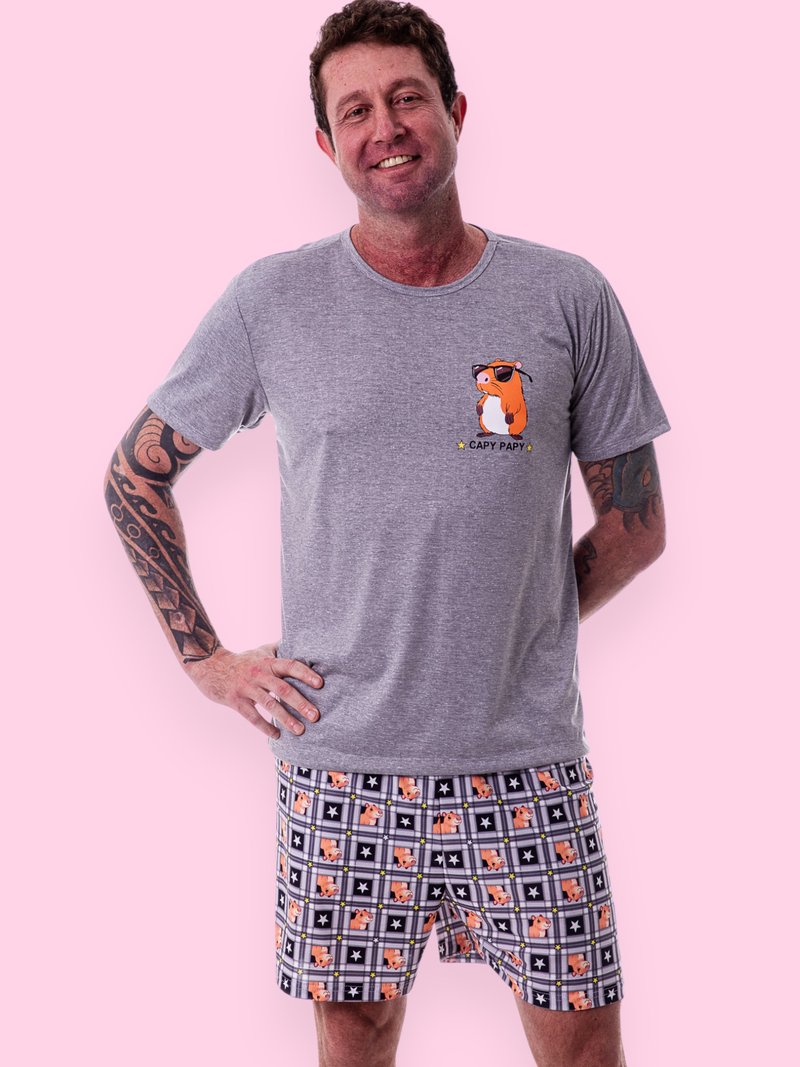 Confortável, moderno e cheio de personalidade, o pijama masculino “Capy Papy” faz parte do nosso kit de pijamas para toda a família.