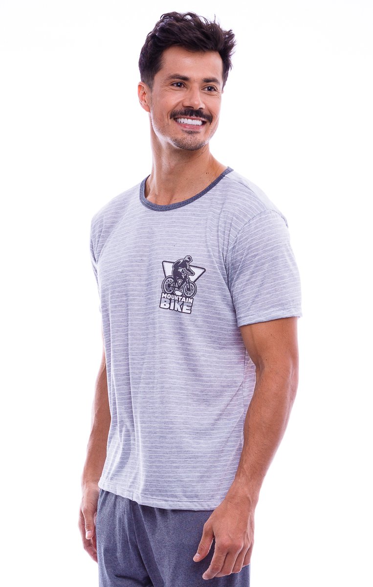 Blusa de manga curta confeccionada em meia malha, com detalhe em cor contrastante no decote.