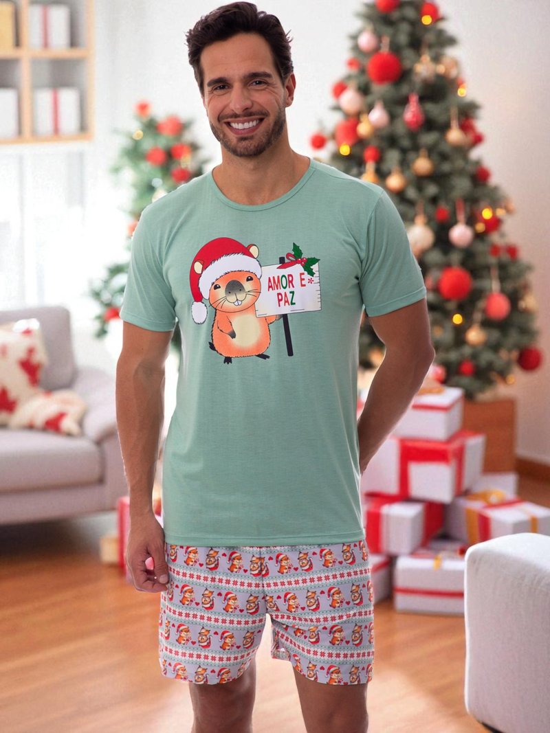 O short tem estampa corrida com desenhos natalinos, combinando perfeitamente com a camiseta para um visual alegre e festivo.