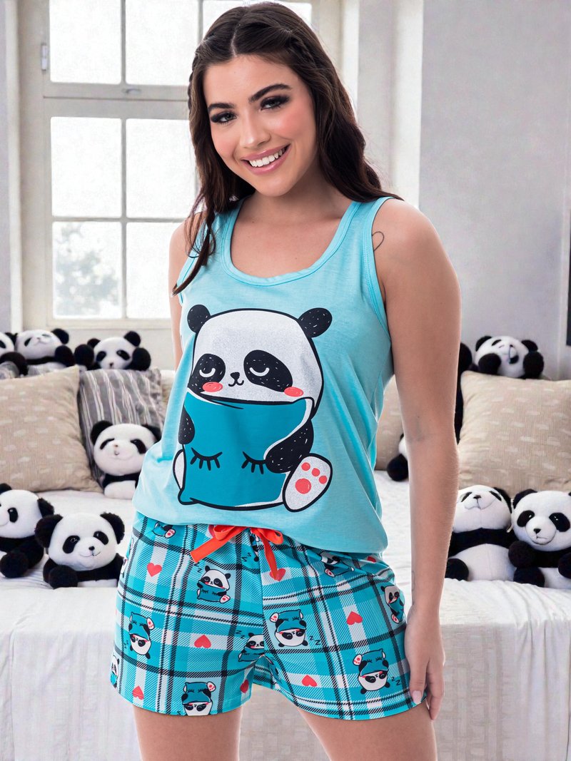 A blusa possui uma modelagem regata soltinha, com decote redondo, garantindo frescor e liberdade de movimentos, ideal para as noites mais quentes. O shorts complementa o conjunto com uma estampa xadrez em tons de azul e branco, adornada com pequenos corações rosa e múltiplos pandas adormecidos, criando um visual harmonioso e incrivelmente fofo.